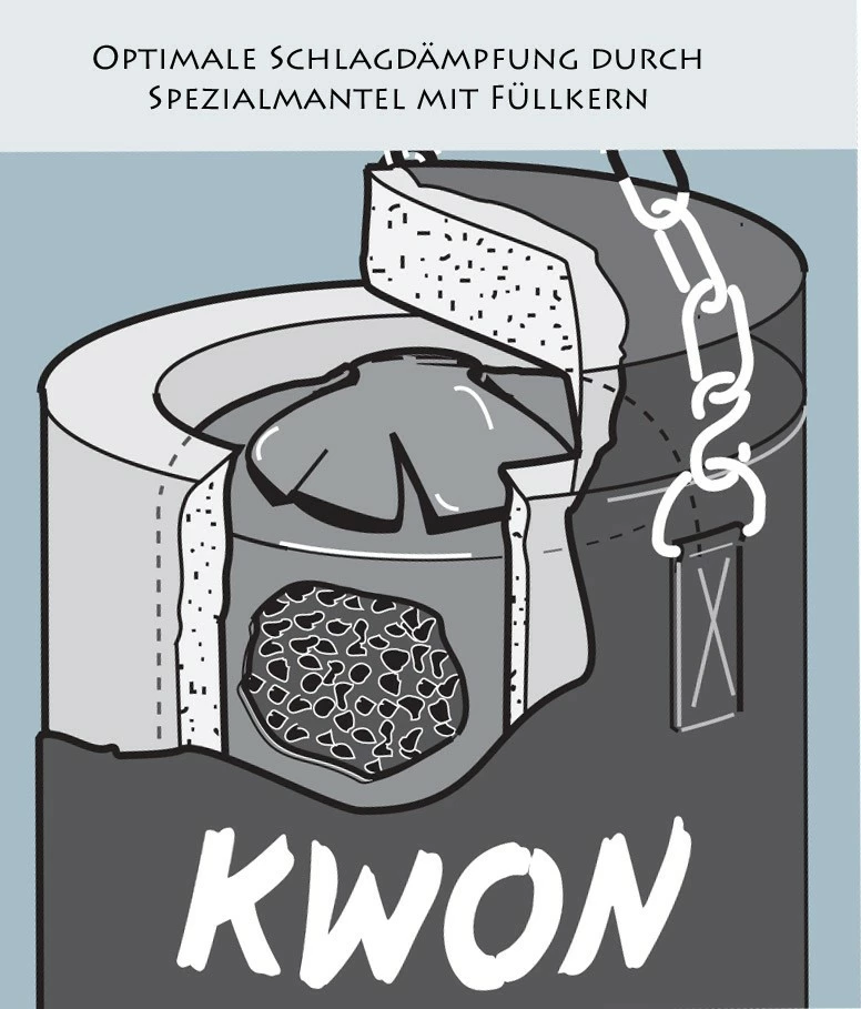 Durch einen Spezialmantel um den Füllkern wird eine optimale Schlagdämpfung erzielt. Der Boxsack zeichnet sich durch gute Dämpfungseigenschaften aus, die eine gelenkschonende Absorption der Schlagkraft ermöglichen.