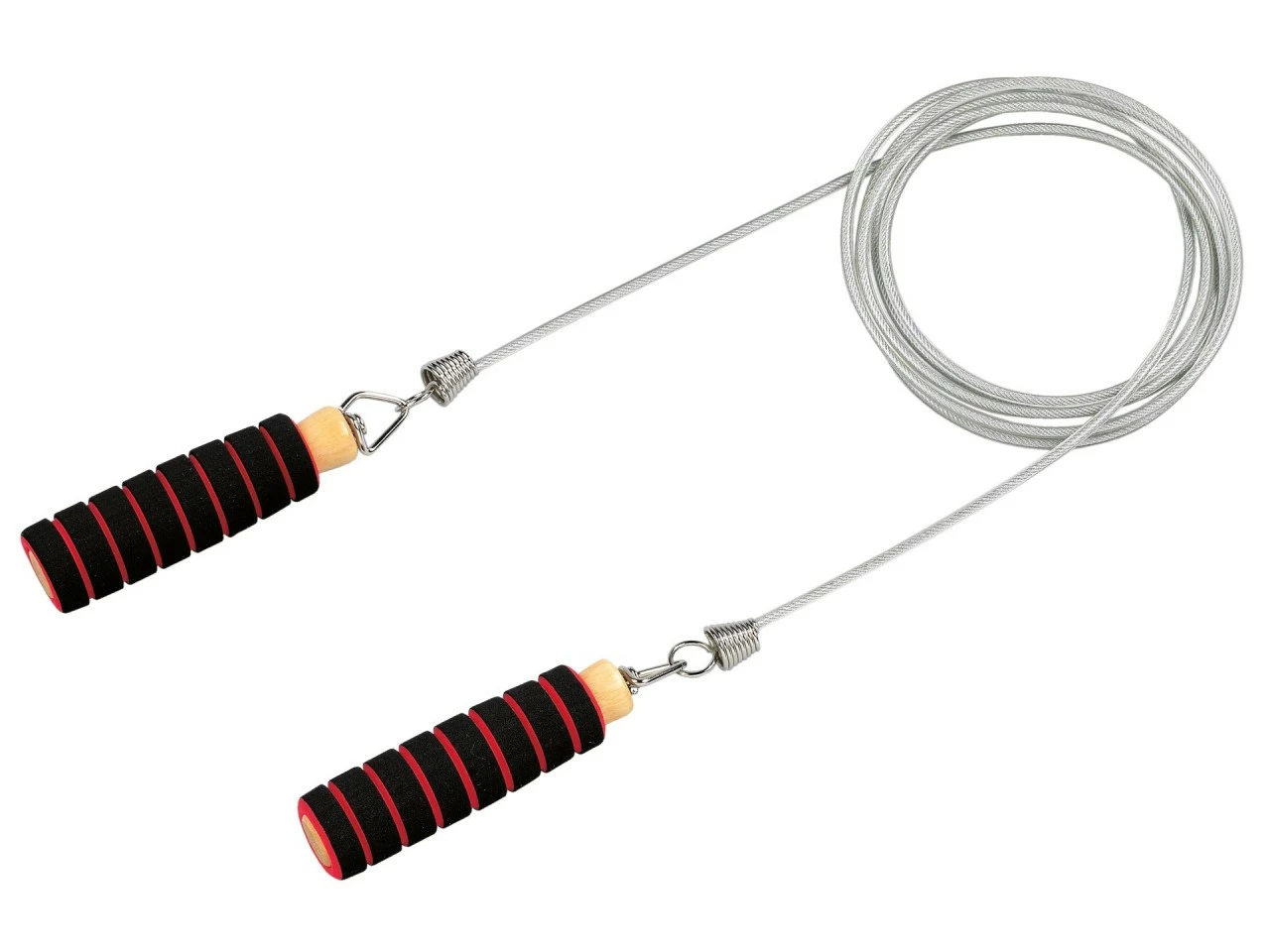 Springseil mit gummiummantelten Holzgriffen und drehbarer Verbindung zum Seil.