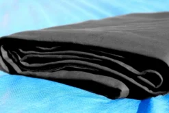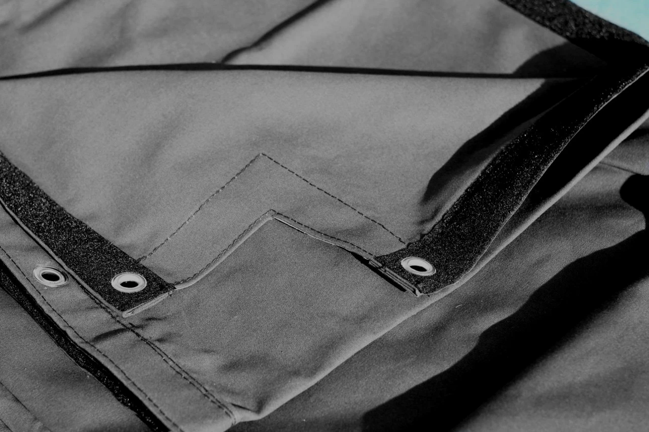 Rutschfeste Profi-Ringplane aus schwarzem Segeltuch ca. 600 g/qm, gesäumt und geöst, mit Klettband für Seitenteile.