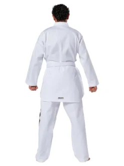 Der Taekwondo Anzug hat auf dem linken Jackenärmel und linken Hosenbein einen großen „KWON“ Schriftzug.