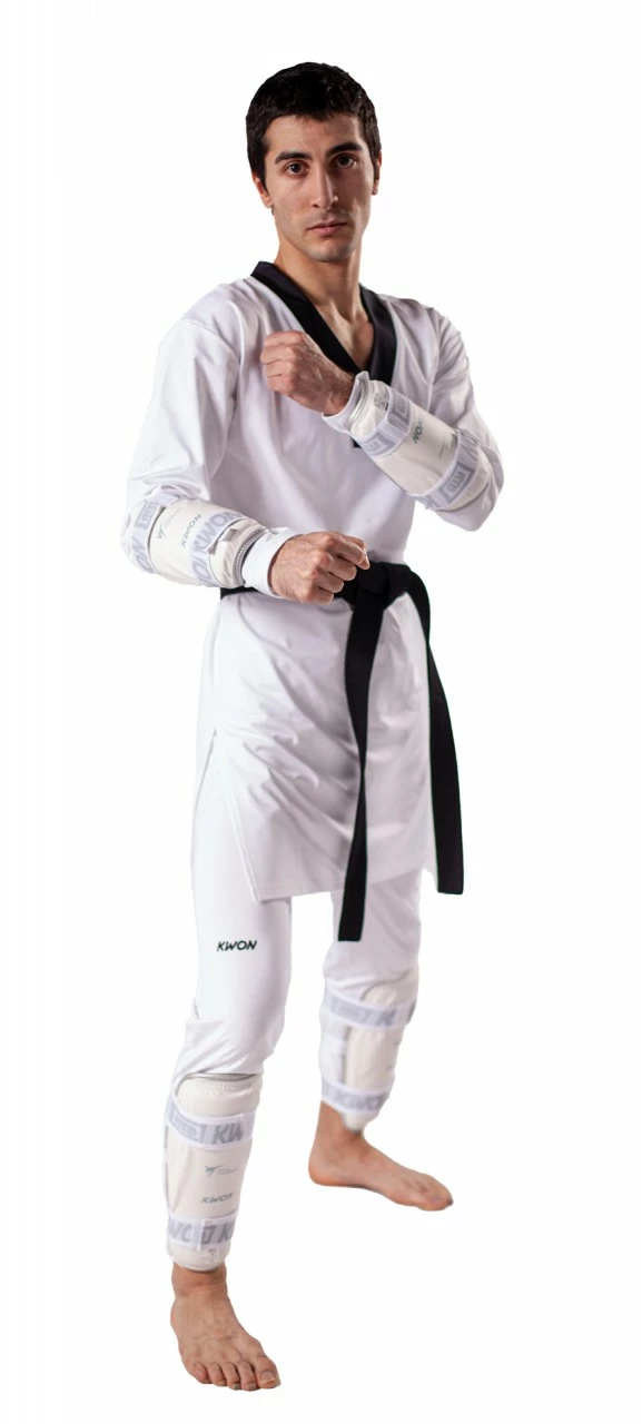 Der Taekwondo Unterarmschutz KSL besticht durch seine edel, dezente und sportliche Optik. Das Obermaterial ist aus leicht glänzendem Kunstleder mit eingearbeitetem Waffelmuster. Das WT-Logo und die Klettverschlüsse sind in dezentem Silberton gehalten, wodurch sie unter dem Anzug fast nicht auffallen.